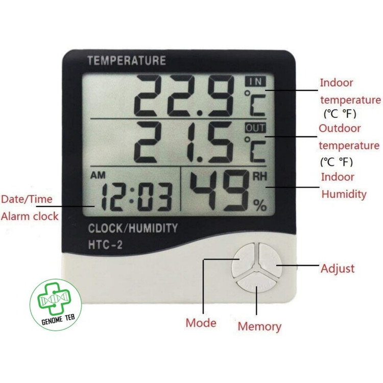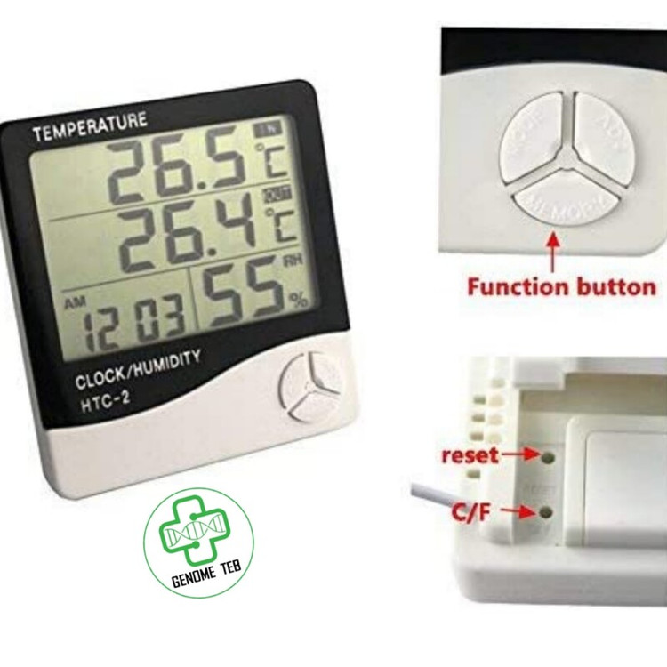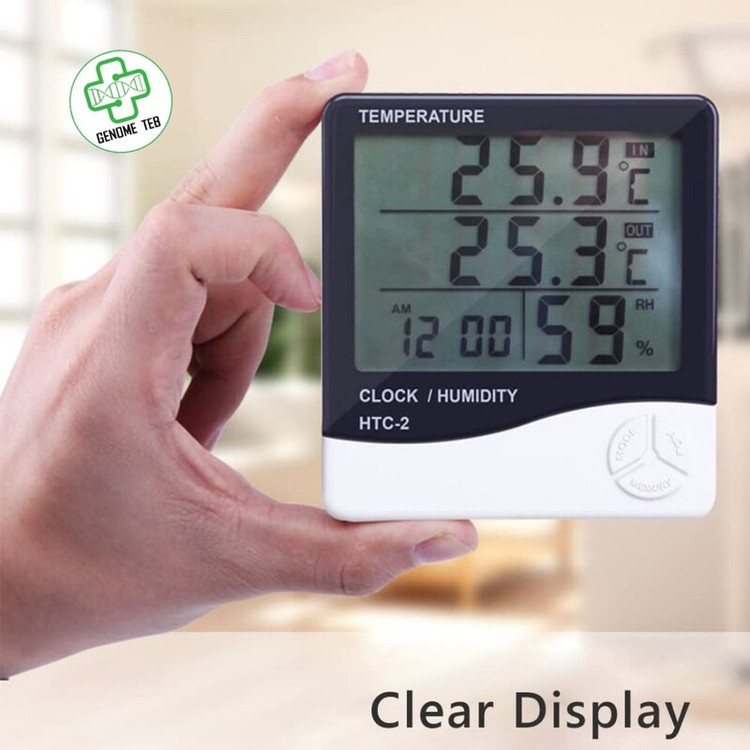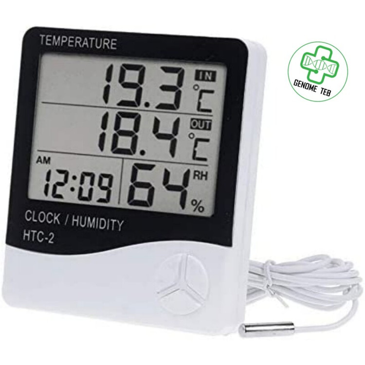 دماسنج رطوبت سنج HTC-2 برای اندازه گیری دما و رطوبت محیط بکار می رود. این دما سنج دارای دو سنسور دما و یک سنسور رطوبت داخلی می باشد. سنسور دمای اول داخلی بوده و سنسور دمای دوم دارای سیم 1.5 متر می باشد. این ترمومتر دیجیتال محیطی بصورت رومیزی و یا دیواری قابل استفاده می باشد. این رطوبت سنج دیجیتالی محیط دارای تاریخ و ساعت و حافظه ماکزیمم و مینیمم می باشد. دستگاه با یک باتری نیم قلمی چندین ماه کار می کند.مشخصات فنی:- اندازه گیری دمای داخلی :-10تا +50 درجه سانتی گراد- اندازه گیری دمای خارجی:-50 تا 70 درجه سانتی گراد-دقت اندازه گیری دما:1درجه سانتی گراد- اندازه گیری رطوبت:10-99 درصد- دقت اندازه گیری رطوبت :5درصد- دارای حافظه ماکزیمم و مینیم گیری برای دما و رطوبتمحدوده اندازه گیری دمای درونی ۱۰- تا ۵۰ درجه سانتی گراد. محدوده اندازه گیری دمای بیرونی۵۰- تا ۷۰ درجه سانتی گراد.